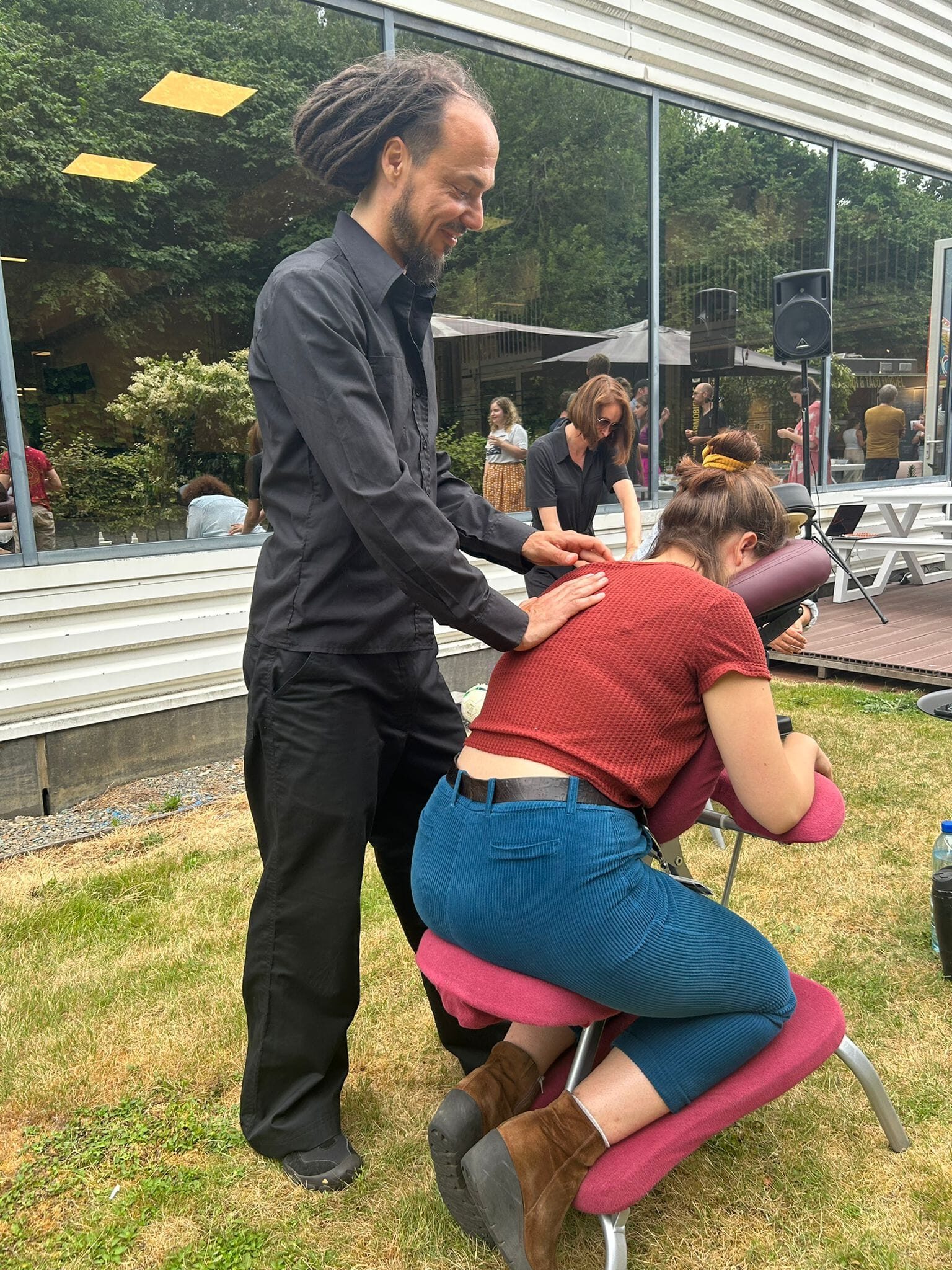 Tijdens die jaren op de weg zag ik hoe de werkwereld veranderde. Mensen zochten naar snellere, efficiëntere manieren om te ontspannen. De stoelmassage, een techniek die ik door mijn shiatsu-achtergrond perfect beheerste, bleek het antwoord. Wat begon als een enkele massagestoel in mijn camper, groeide uit tot een service waar we nu met tot acht masseurs tegelijk bedrijven bezoeken.